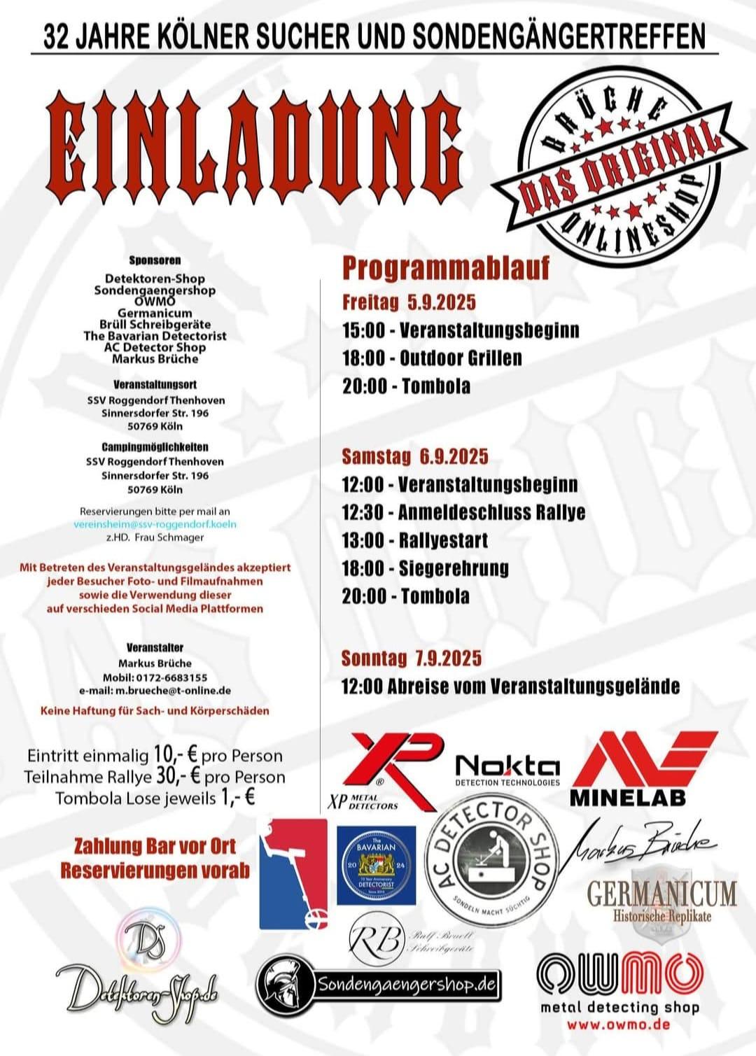 Auch in diesem Jahr sind wir wieder vor Ort beim legendären Kölner Sucher- und Sondengängertreffen, das 2025 bereits zum 32. Mal stattfindet!